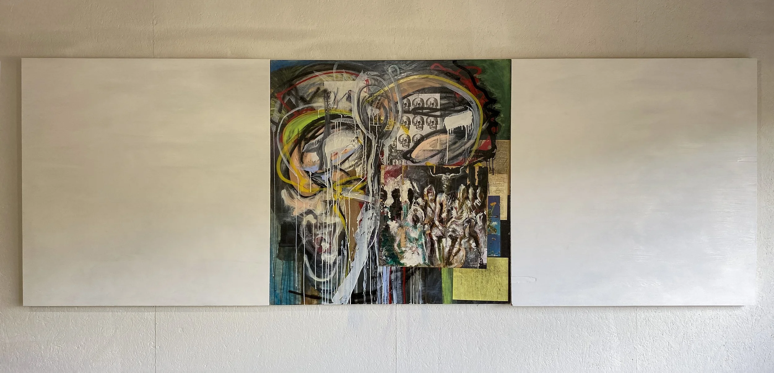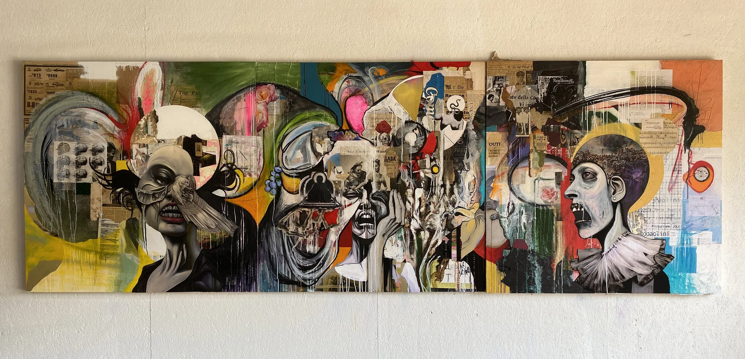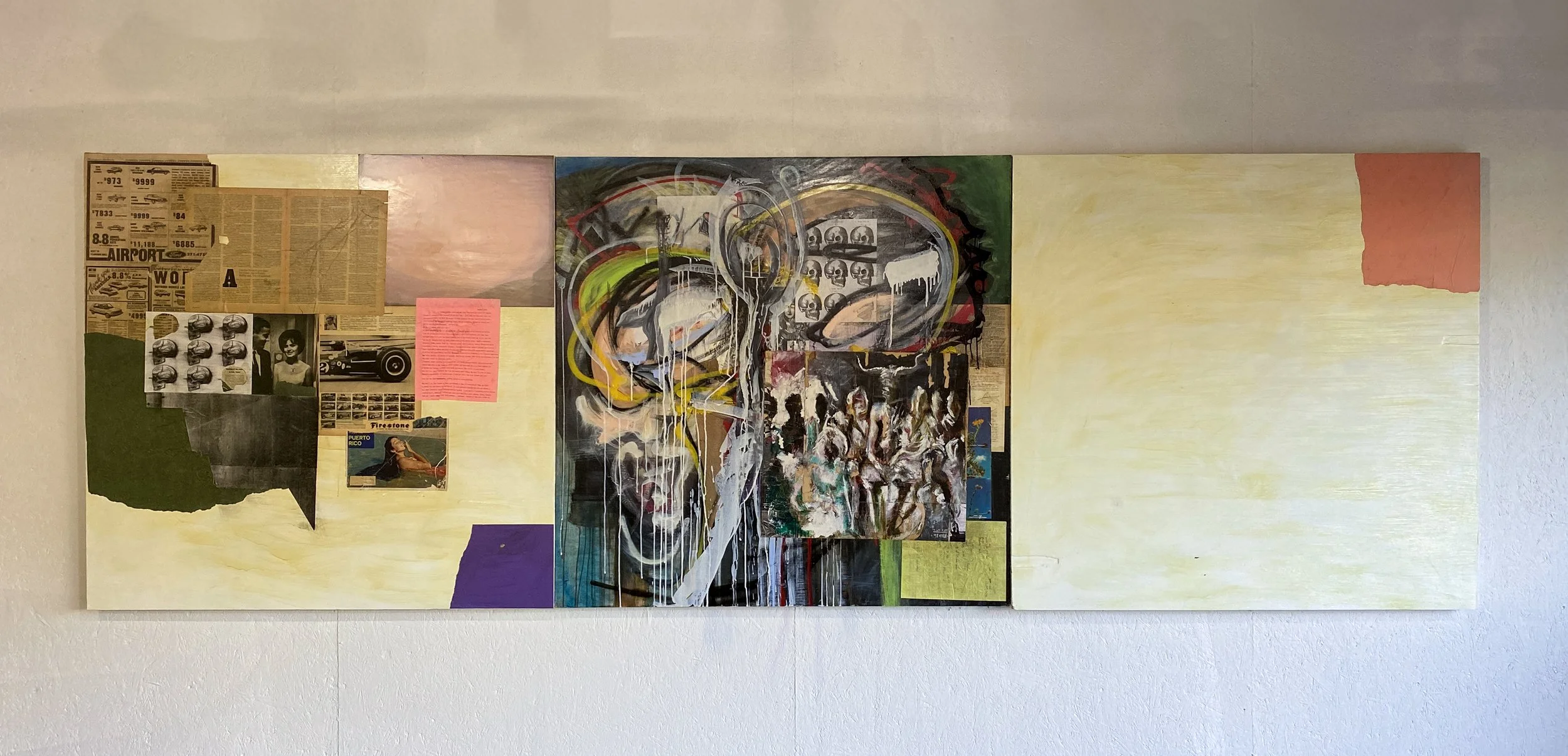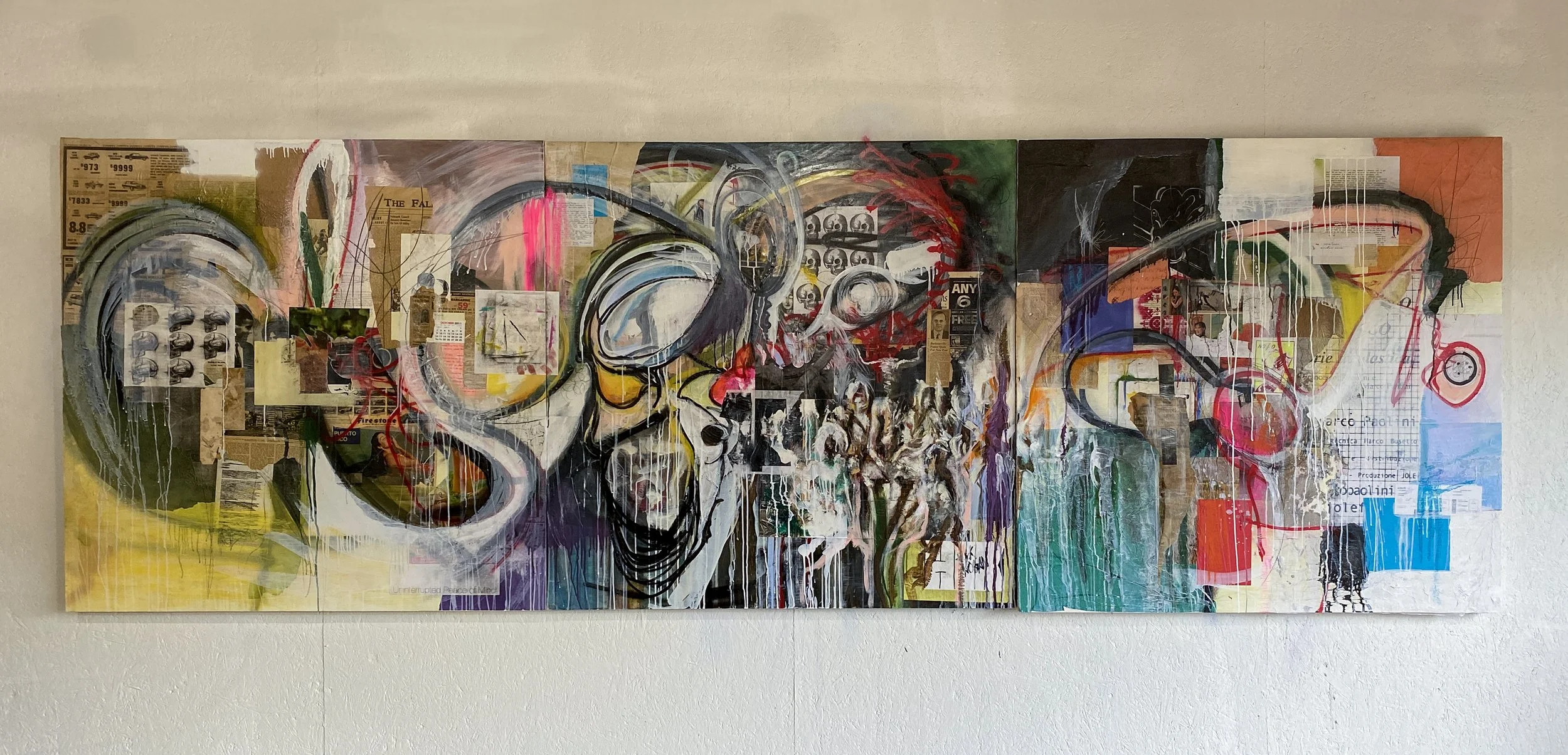 In my most recent endeavors, digital processes have assumed a pivotal role. As I begin working on a physical canvas, I meticulously capture photographs of the evolving painting, documenting the stages and nuances of the development, a record of the creative evolution. The digital realm doesn't merely serve as a storage space for these images; it's a canvas. I leverage the power of AI to blend and manipulate these photographs, creating new visual narratives that fuse elements of the paintings. I reintroduce collage elements and themes to the AI. The resulting synthesis introduces a level of randomness into the work—a symbiotic relationship that breathes new life into the creative process. I paint digitally creating alternate versions of the pieces, work, and rework, combine and blend—a natural evolution of my collage process.