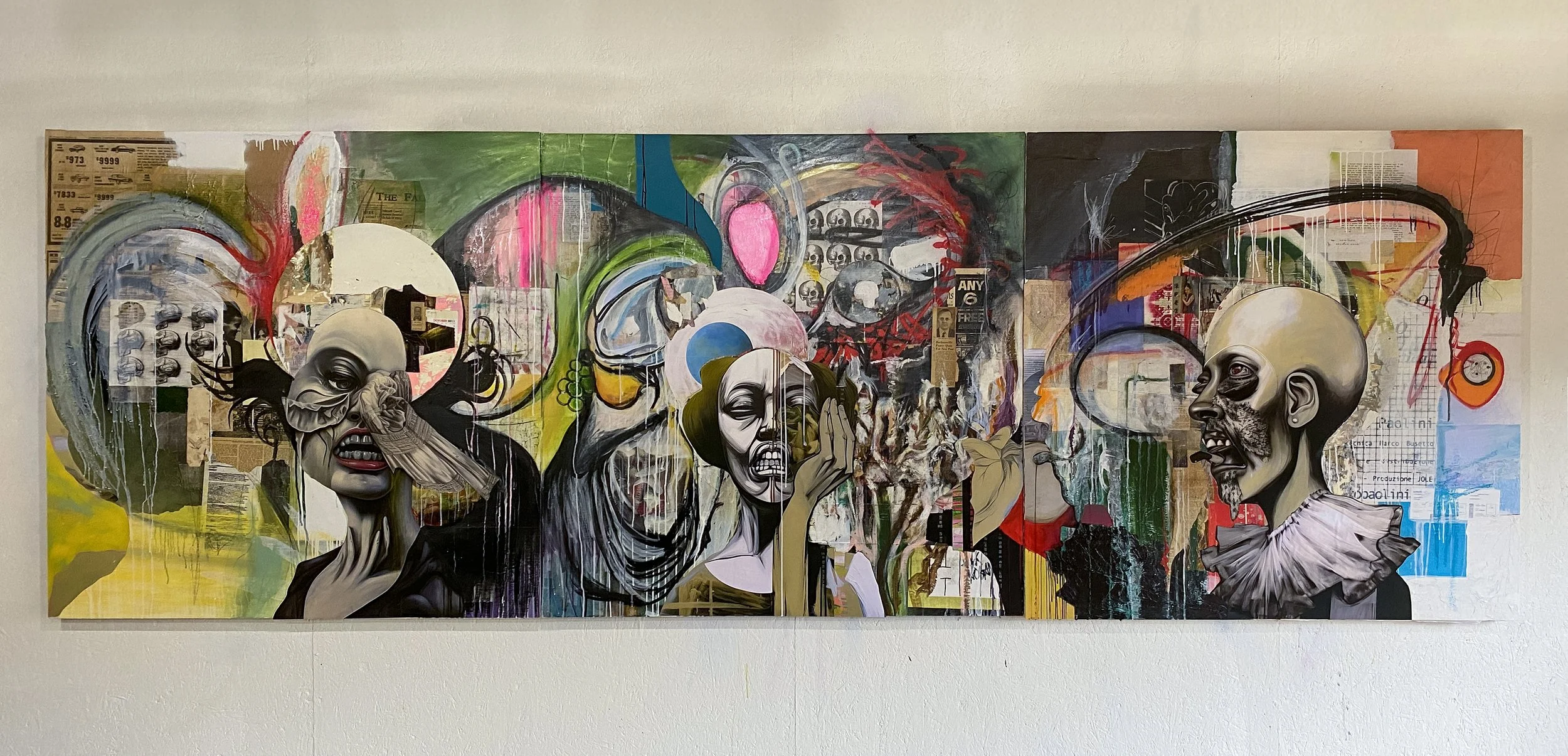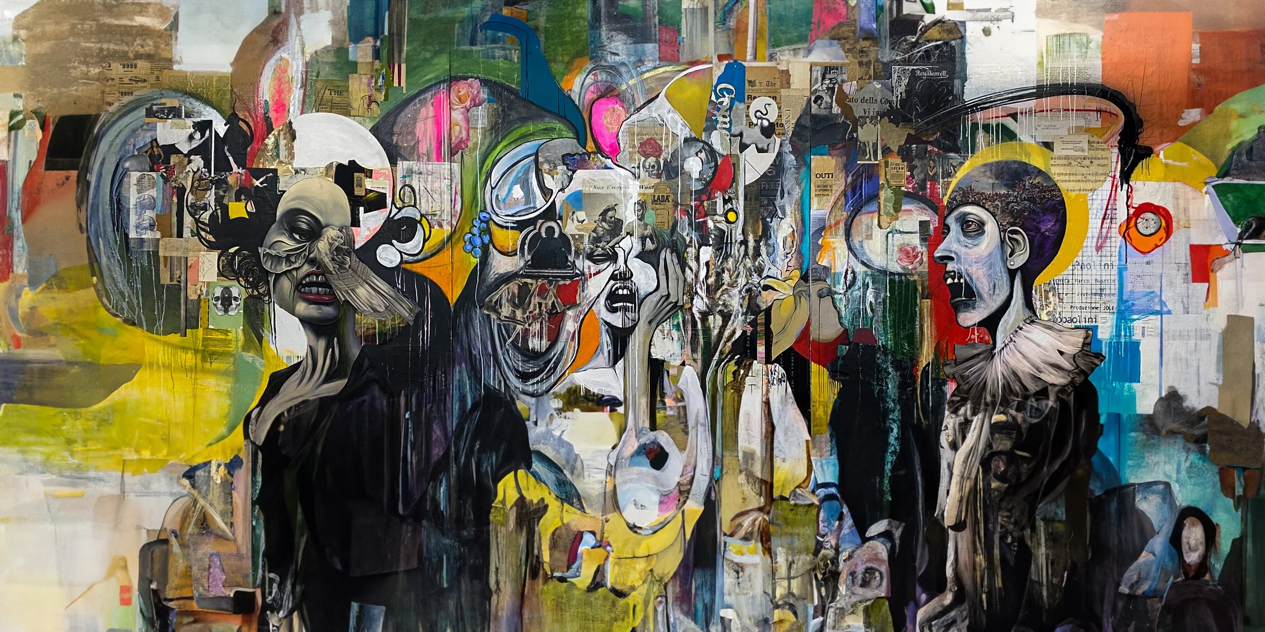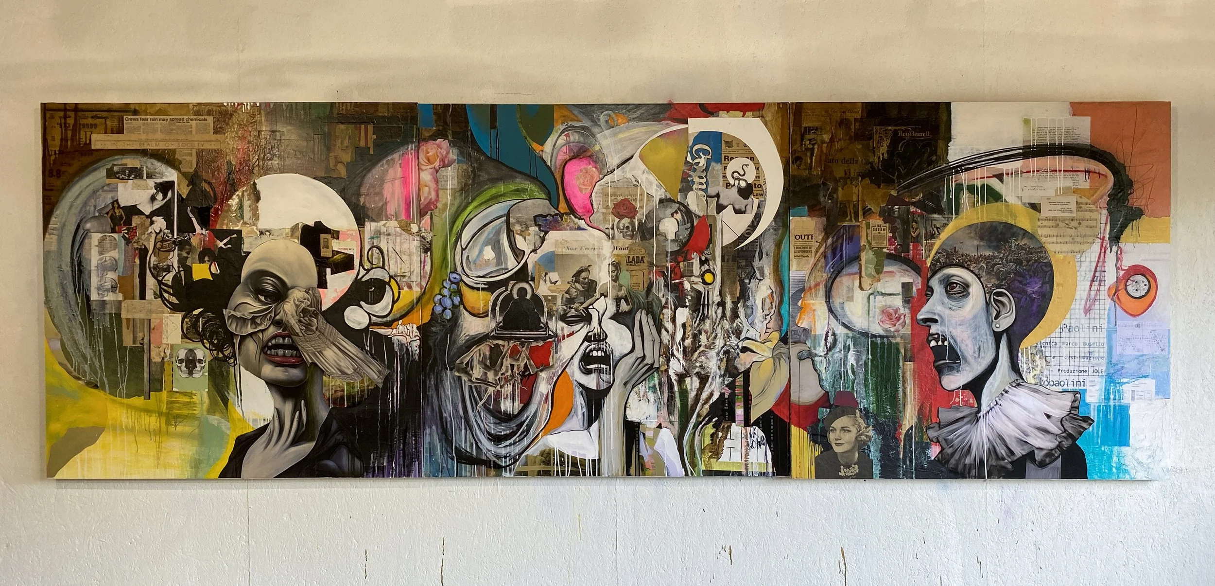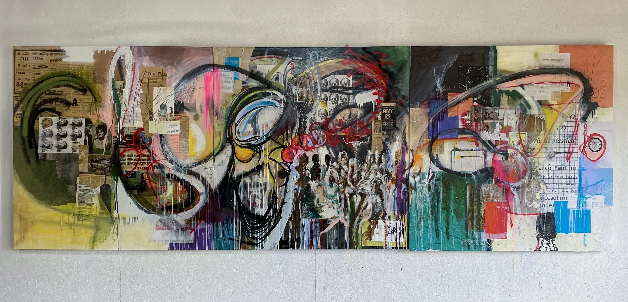In my most recent endeavors, digital processes have assumed a pivotal role. As I begin working on a physical canvas, I meticulously capture photographs of the evolving painting, documenting the stages and nuances of the development, a record of the creative evolution. The digital realm doesn't merely serve as a storage space for these images; it's a canvas. I leverage the power of AI to blend and manipulate these photographs, creating new visual narratives that fuse elements of the paintings. I reintroduce collage elements and themes to the AI. The resulting synthesis introduces a level of randomness into the work—a symbiotic relationship that breathes new life into the creative process. I paint digitally creating alternate versions of the pieces, work, and rework, combine and blend—a natural evolution of my collage process.
